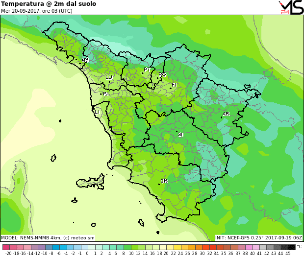 L’ ultima perturbazione della serie è transitata nella tra ieri e oggi sulla Toscana. Rimarrà un po’ di variabilità e potrà arrivare qualche scroscio di pioggia entro la tarda sera ma il tempo volge comunque ad un miglioramento. Già da domani, mercoledì 20 settembre, il cielo si presenterà sereno o poco nuvoloso con qualche addensamento più consistente tra tarda mattinata e pomeriggio, sulle zone interne, ma in assenza di piogge. Clima molto fresco nella notte e per nulla caldo durante il giorno. Attese minime diffusamente al di sotto dei 10°C come mostra la mappa relativa alle temperature delle ore 5 sulla Toscana. Massime in rialzo di 2/3° ma pur sempre contenute su valori inferiori alla media del periodo.