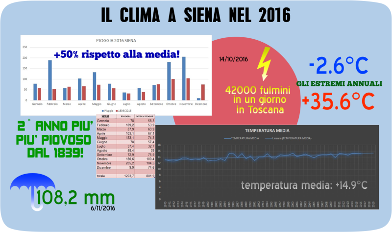 Dal punto di vista delle temperature il 2016 a Siena risulta essere una delle annate più calde di sempre con una temperatura media annuale di +14,9°.